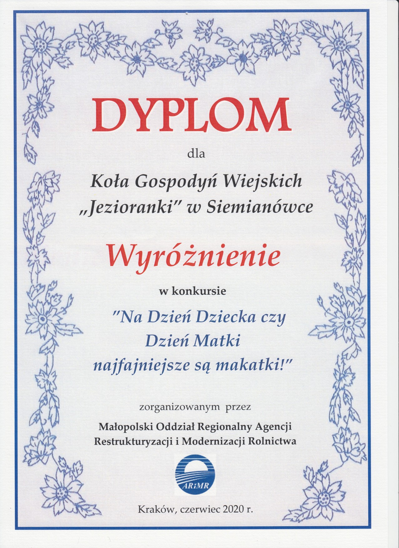 Nasze nowe wyróżnienieAktualnościNasze nowe wyróżnienieDodano dnia: 04-06-2020Dziękujemy Małopolskiemu Oddziałowi Regionalnego ARiMR za wyróżnienie w konkursie "Na Dzień Dziecka czy Dzień Matki najfajniejsze są makatki". Jesteśmy dumni, że mamy w swoim gronie takie zdolne Kobietki.